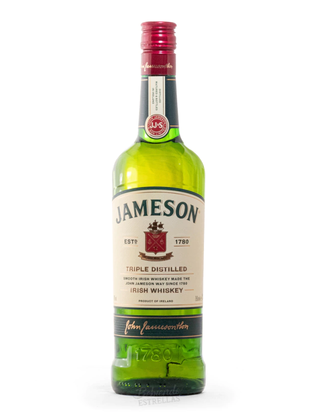 Origen: Irlanda.Tipo de producto: Blend Irish Whiskey. Grado alcohólico: 40% alc./vol. Tipo de elaboración: Destilado – Triple destilación. Materia prima base: Cebada Malteada y otros cereales (maíz, trigo). Descripción: Color dorado cálido. Aroma Suave y fragante, con notas de madera tostada y jerez. Su sabor es excepcionalmente suave, dulce y complejo. Delicada fusión de sabores tales como vainilla, madera de roble, miel, complementados por especias, caramelo y nuez. De final delicado y persistente en el paladar. Su mayor suavidad se debe gracias a su triple destilación. De sabor agradable, no ahumado por la no utilización de turba en el proceso de malteado de la cebada. Jameson utiliza un porcentaje mayor de barricas de Jerez para la maduración de sus whiskies lo que otorga su particular aroma y color ámbar rojizo. Jameson es el whiskey Irlandés Nº 1 del Mundo. Modo de consumo: Solo, con hielo, con agua mineral o en cócteles.