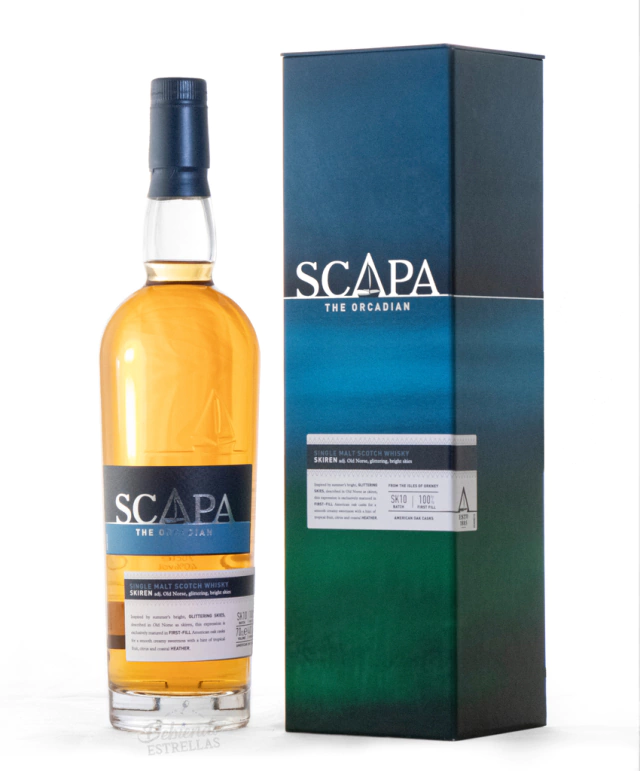 Scapa es único en la maduración de la cebada de malta utilizada para la fabricación de whisky, ya que se selecciona cuidadosamente y está completamente separado de los agentes ambientales que influyen en cualquier tipo de contaminación; el agua, es el secreto principal de este aclamado whisky. A se realiza principalmente por la influencia del mar, su aire, su humedad y en general los viejos balastos de madera que almacenan el olor del aire que tiene lugar en esta zona costera. Esta versión llamada skiren, lo que significa cielos brillantes o sol del verano en nórdico antiguo sustituye al ya conocido scapa 16 años. Scapa skiren es una versión de 2015, envejecido en barricas de primer llenado de roble americano. esto le transfiere un dulzor suave, cremoso y dulce, con notas de frutas tropicales y brezo.
